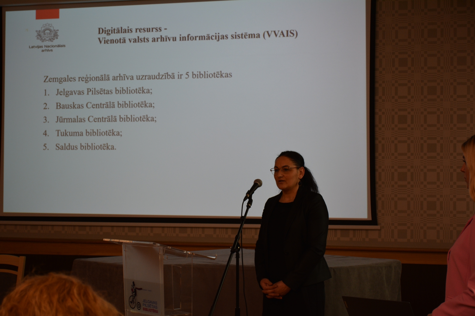 Savukārt Zemgales reģionālā arhīva direktore Iveta Arbidāne un vecākā eksperte Vita Jansone iepazīstināja klātesošos ar Digitālo resursu pieejamību Zemgales reģionālajā arhīvā Jelgavā, pastāstot klātesošajiem valsts vienotās arhīva informatīvās sistēmas pieejamību institūcijām dokumentu un pārvaldības jomā.